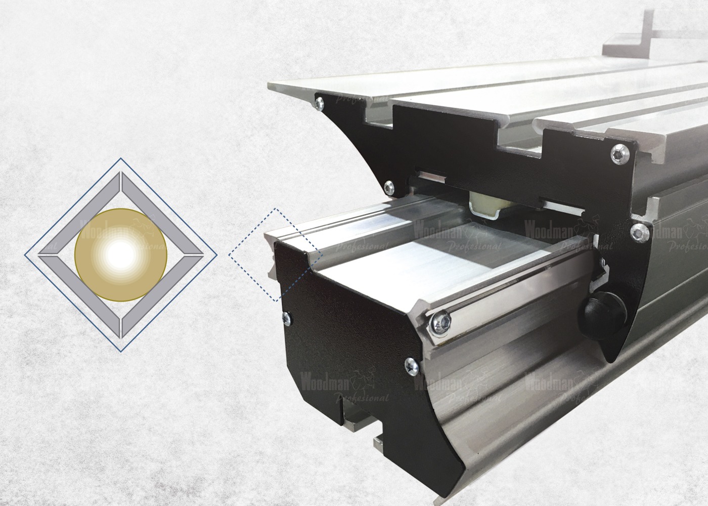 The support table is connected to the aluminum carriage by a quick eccentric lock. The reinforced outrigger provides smoother sliding and high cutting precision.